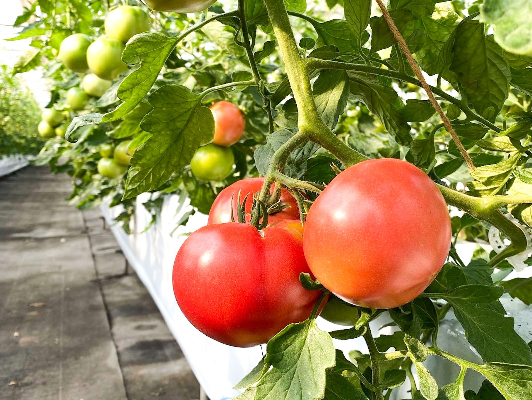 美味しさの決め手は「養液隔離栽培」。土の代わりに、「いちのまい」のもみ殻を炭にした「もみ殻くん炭」を敷き詰めることで土が原因の病気を防ぎ、養分・水分をコンピューター管理で与えることで、トマト自身が必要な養分を取り入れてすくすく育ちます。もみ殻を再利用することで、持続可能な農業を目指しています。